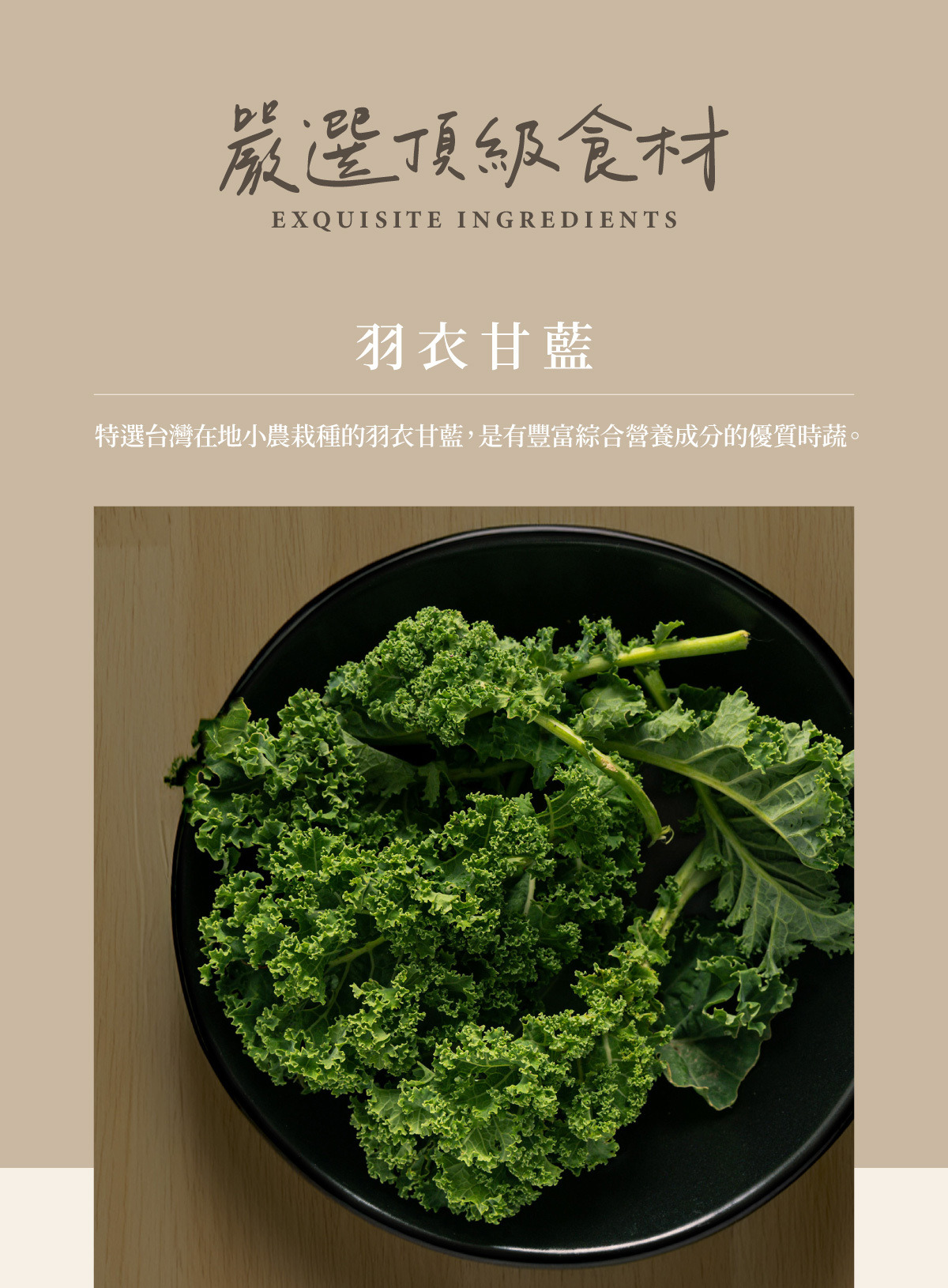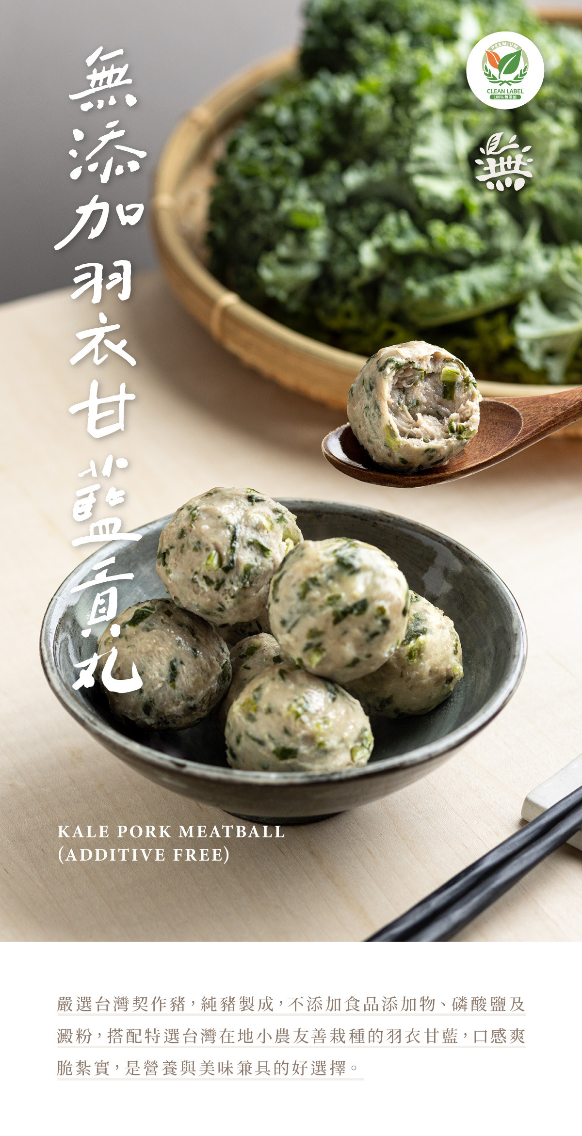 ★嚴選台灣契作豬,純肉製成,搭配特選台灣在地種植的羽衣甘藍,口感爽脆紮實,是營養與美味兼具的好選擇。