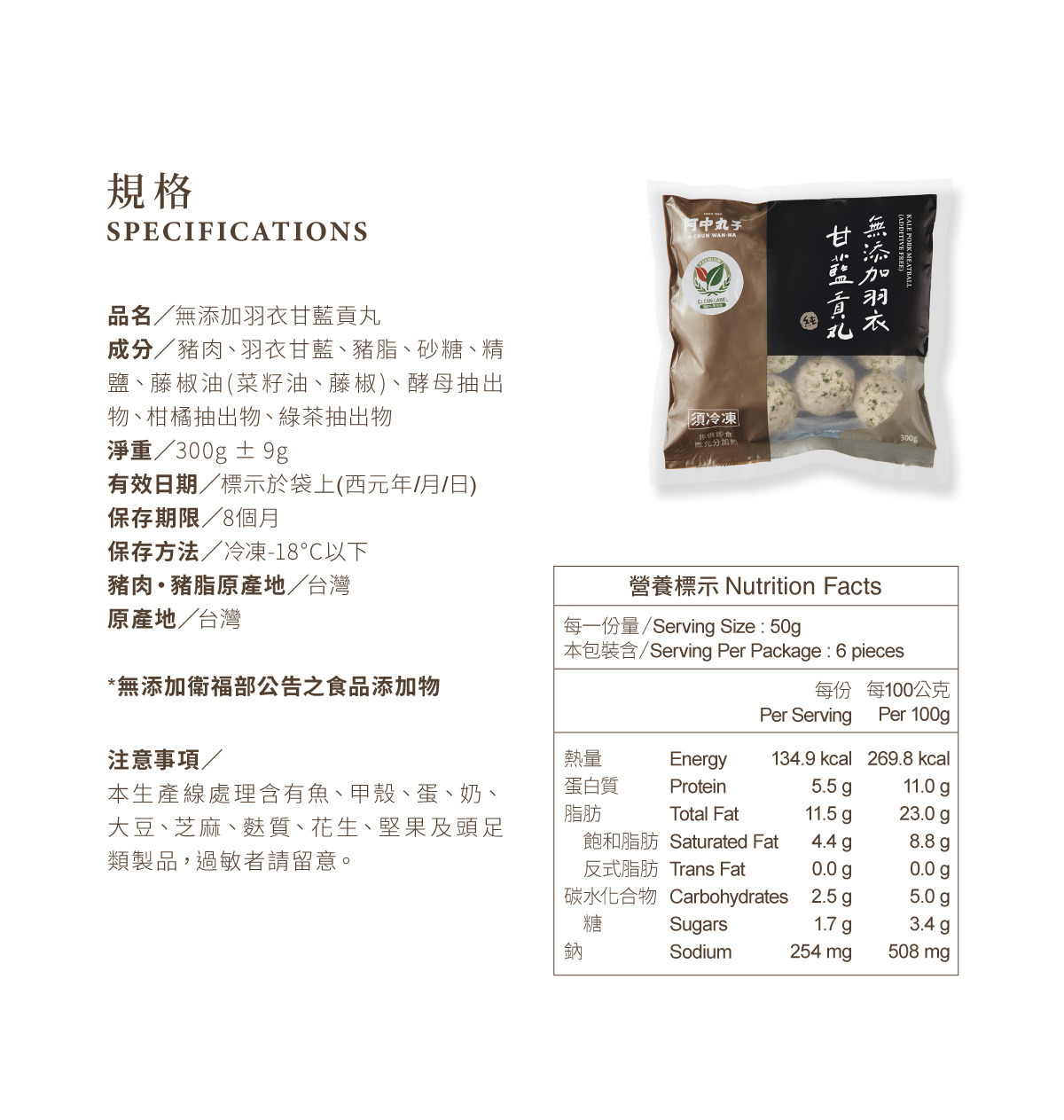 無添加羽衣甘藍貢丸 (300G/約12顆入)|契作台灣神農豬|無磷酸鹽 Kale Pork Meatball (Additive Free)
